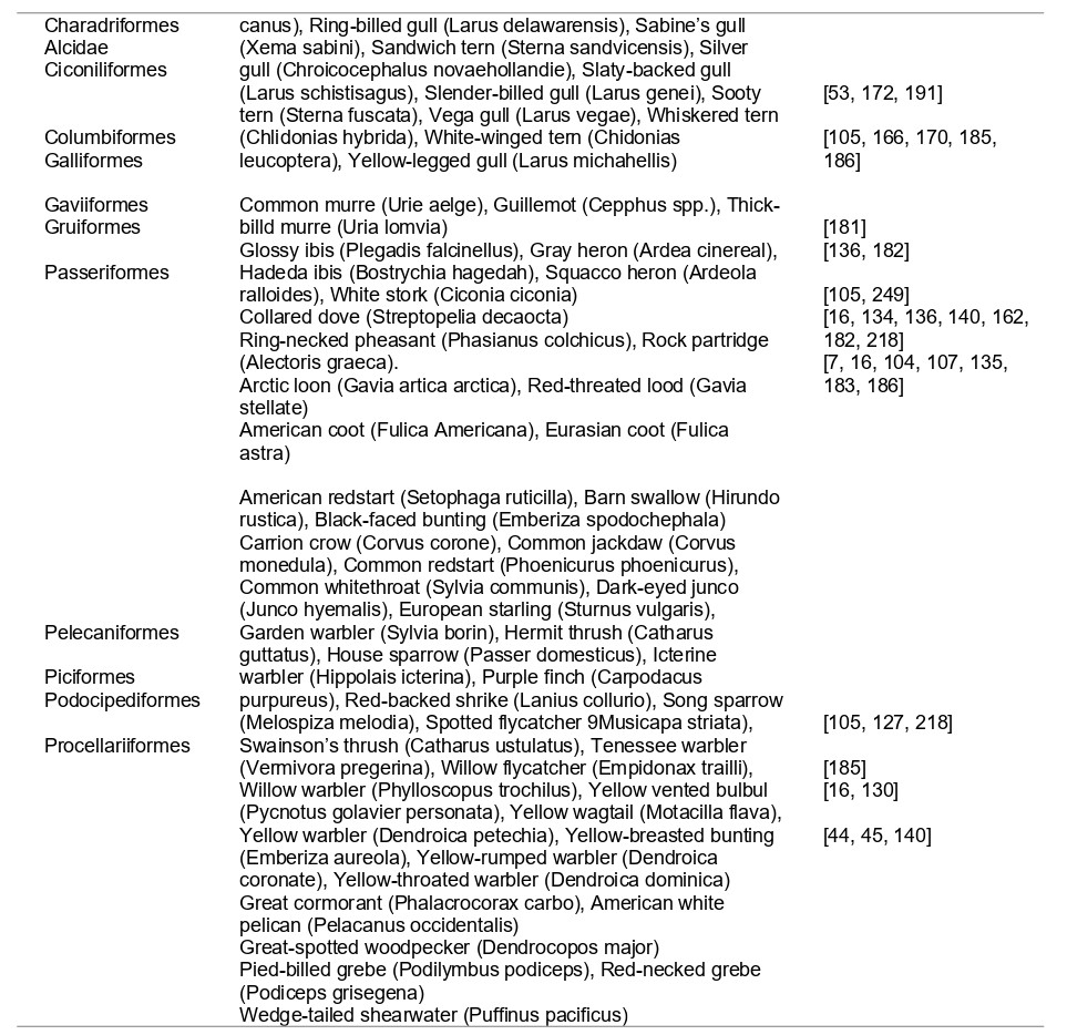 Isolat juga telah dilaporkan dari spesies lain yang tinggal di habitat akuatik, meliputi unggas yang ada pada ordo Ciconiiformes, Gaviiformes, Gruiformes, Pelecaniformes, Podocipediformes, dan Procellariiformes. Secara kolektifnya, burung ini meliputi sedikit spesies positif (Tabel 7.1). Sangat mungkin bahwa banyak hasil positif ini berhubungan dengan tumpahan (spillover) virus dari itik dan burung camar dalam habitat akuatik bersama. Hal ini yang terjadi pada isolat-isolat yang baru-baru ini dilaporkan dari American white pelicans (Pelacanus occidentalis) [127] dan red-necked grebes (Podiceps grisegena) [130] yang diambil sampelnya dari habitat burung air di Minnesota. Pada kedua kasus, virus-virus yang diisolasi dari spesies-spesies ini jelas merefleksikan asal dari itik ataupun asal campuran dari itik dan burung camar.