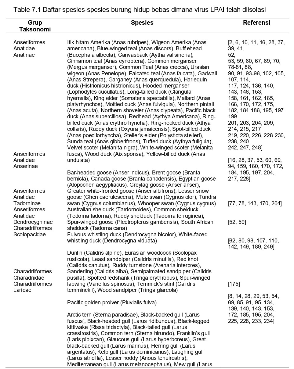 Ada beberapa review yang sudah dipublikasikan yang menyediakan informasi mendetail tentang kisaran hospes AIV pada unggas liar [157, 206, 211]. Dengan bertambahnya jumlah spesies akibat dari bertambahnya surveilans dan penelitian, daftar yang sudah diperbaharui disajikan dalam tabel 7.1. hasil yang disajikan dalam tabel ini masih tidak mewakili kisaran hospes yang sebenarnya, karena hanya berdasarkan laporan isolasi virus. Terdapat laporan tambahan hasil positif polymerase-chain reaction (PCR) dari spesies-spesies yang belum pernah diisolasi virus AI darinya, dan juga ada banyak sekali spesies yang belum pernah diujikan.