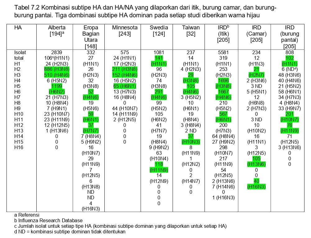 Terdapat 16 subtipe hemaglutinin (HA) dan 9 subtipe neuraminidase (NA) dari virus AI, dan sebagian besar kombinasinya telah dilaporkan dari burung liar [158]. Akan tetapi, subtipe-subtipe ini tidak terepresentasi secara seimbang diantara populasi burung liar dan variasi antar hospes, lokasi, musim, dan tahun juga dapat terjadi. Pada itik Amerika Utara, subtipe H3, H4, dan H6 mewakili subtipe HA predominan yang dilaporkan [119, 194, 206]. Beberapa subtipe HA (missal H11) sering diisolasi, dan lainnya (misal H8 dan H9) tidak umum [199, 206]. Trend-trend predominan ini ditemukan di Eurasia dan Amerika Utara [32, 124, 148, 243] (Table 7.2). Pada burung camar, keragaman subtipe tidak terdefinisikan secara jelas, akan tetapi virus H13 dan H16 secara konsisten mendominasi di seluruh dunia [8, 110, 119, 157]. Subtipe-subtipe lain, meliputi H1, H6, H10, dan H11 secara rutin diisolasi dari burung camar akan tetapi dengan prevalensi yang relative rendah [8, 69]. Sedangkan pada burung-burung pantai, pengetahuan kita tentang keragaman subtipe masih terbatas skop nya, dengan sebagian besar isolate berasan dari burung ruddy turnstone di Teluk Delaware, Amerika Serikat. Sembilan subtipe HA dari virus AI telah dilaporkan terjadi lebih sering pada Charadriiformes daripada pada itik, termasuk diantaranya virus AI H5, H7, dan H9 [119]. Pada Teluk Delaware, virus H6, H7, H10, H11, dan H12 sangat terwakili (over-represented) pada burung-burung pantai, virus-virus ini dapat saja muncul hampir setiap tahun, atau merupakan subtipe dominan pada satu tahun tertentu [213]. Seperti pada burung camar, subtipe H1, H6, H10 dan H11 terwakili dengan baik, maka subtipe H13 dan H16 sebaliknya malah tidak terwakili dengan baik (Tabel 7.2).