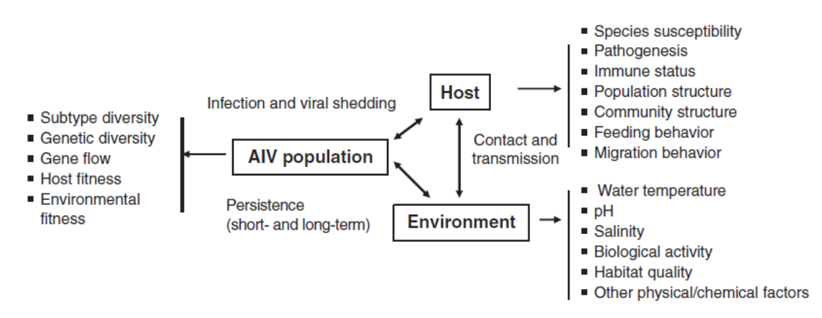 Pada saat ini pemahaman kita tentang AIV pada reservoir unggas alami sangat ekstensif, akan tetapi belum lagi mendekati lengkap. Seperti yang diperlihatkan pada Gambar 7.1, terdapat banyak variable yang berpotensi mempengaruhi dan mungkin juga meregulasi virus-virus ini diantara populasi virus AI, hospes unggas, dan lingkungan. Pemahaman hubungan interaksi ini diperlukan untuk menjawab pertanyaan-pertanyaan dasar yang berhubungan dengan mempertahankan virus pada populasi burung liar dalam hubungannya dengan system alami maupun system buatan manusia, untuk mengerti keberagaman subtipe, untuk menilai potensi-potensinya dalam menentukan keberhasilan invasi virus AI ke hospes baru ataupun wilayah-wilayah geografis baru, dan untuk mengerti resiko-resiko yang berhubungan dengan pergerakan virus-virus ini kepada hospes hewan domestic ataupun manusia.