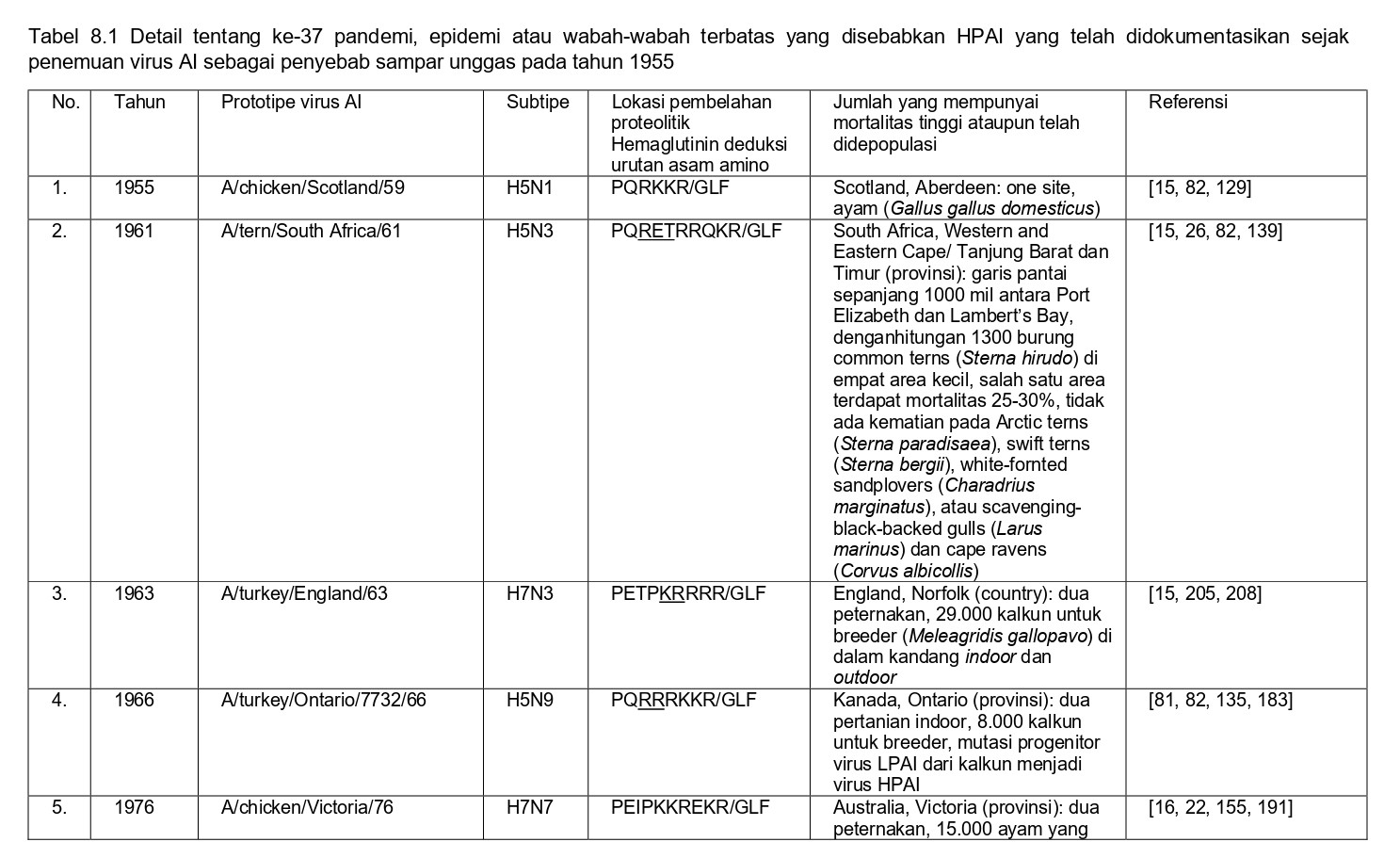 Selama 56 tahun terakhir, sejak perkembangan diagnostik dan strategi pengendalian yang konsisten, sebanyak 37 epidemi atau wabah terbatas HPAI telah didokumentasikan di seluruh dunia, dan kesemuanya dapat dilihat pada tabel 8.1. Semua virus HPAI ini berasal dari subtipe HA H5 dan H7. Belum pernah terjadi wabah HPAI dari 14 subtipe HA lainnya (H1-4, H6, H8-H16), akan tetapi terdapat virus-virus AI H2, H4, H6, H9 dan H14 yang diproduksi melalui sistem genetika terbalik dengan situs pembelahan HA HPAI, dan kesemuanya sangat mematikan bagi ayam [59, 60, 96]. Meskipun begitu, beberapa virus non-H5/H7 yang muncul secara alami juga telah menunjukkan tingkat mematikan yang tinggi pada ayam pada uji patogenisitas melalui intravena, seperti A/mandarin duck/Singapore/805/F-72/7/1993 (H10N5), A/turkey/England/384/79 (H10N4), dan turunan dari A/chicken/Alabama/1975 (H4N8), meskipun virus-virus ini tidak terlalu mematikan melalui okulasi intranasal, dan tidak memiliki sekuens situs pembelahan HA yang cocok dengan virus HPAI [32, 209]. Ditambah lagi, mekanisme yangbertanggungjawab erhadap tingginya tingkat letalitas adalah gagal ginjal yang dikarenakan replikasi virus yang ekstensif pada epitel tubulus ginjal, sebuah mekanisme yang sebelumnya dilaporkan pada ayam yang diinokulasi menlalui intavena menggunakan berbagai variasi virus LPAI [172-175, 209]. Karena itu tingginya letalitas yang terjadi pada tiga isolate virus flu burung ini adalah sebuah fenomena laboratorism dan ketiga virus ini bukanlah virus HPAI yang sebenarnya.
