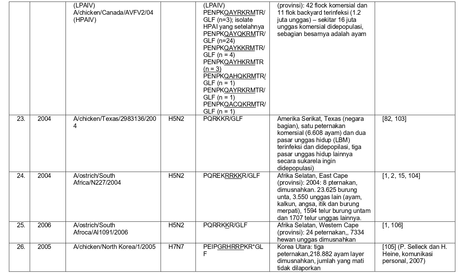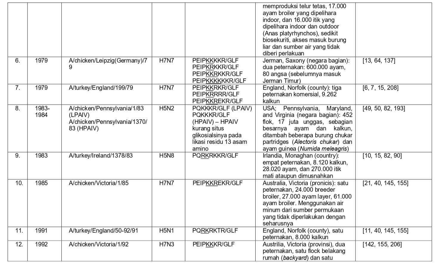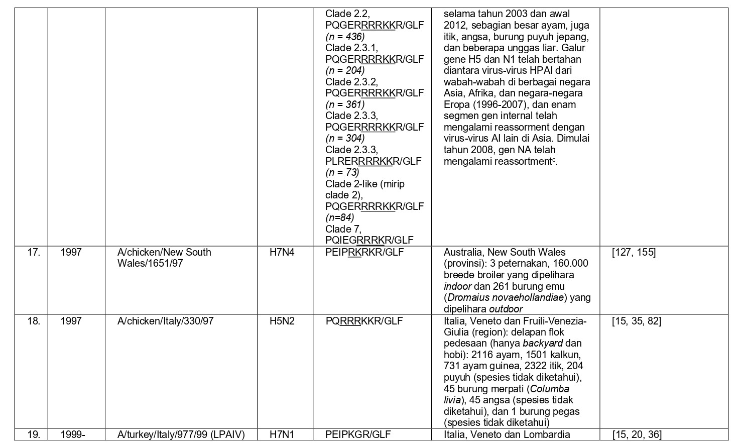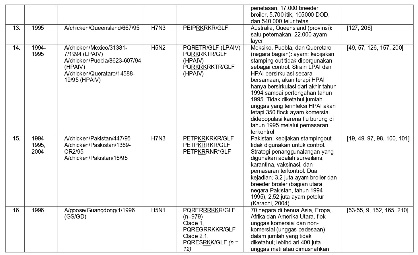 - Virus LPAI H5N1 di Pennsylvania yang menginfeksi 100 flok komersial selama tahun 1983, dan bermutasi menjadi virus HPAI H5N2 [58, 204].