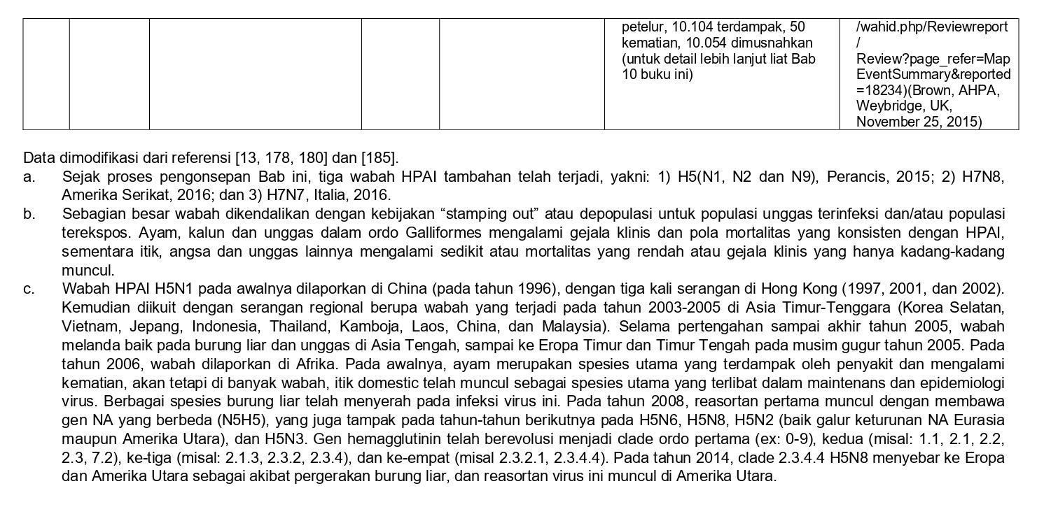 Informasi detail tentang wabah HPAI tahun 1878-2007 dapat ditemukan pada edisi pertama buku ini [188], pada Bab 7 [75], 8 [183], 9 [15], 10 [155], dan 11 [154]. Pada volume ini Bab 9 dan 10 memberikan informasi terbaru tentang epizotik dari tahun 2008 sampai 2015.