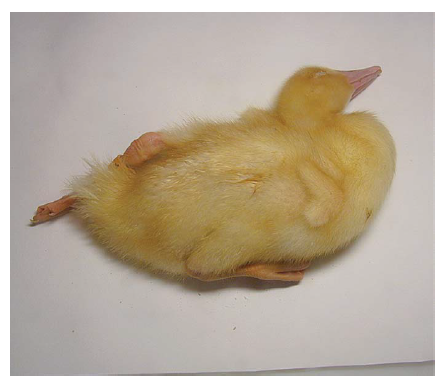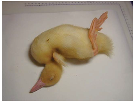 Gambar 13.1 Anak Itik Peking berumur dua minggu menunjukkan gejala neurologis berat pada hari ke-3 setelah inokulasi IN (intranasal) dengan virus HPAI H5N1 A/egret/HK/757.2/02. Foto diterbitkan dengan izin dari buku Avian Diseases. Hak cipta dipegang oleh American Association of Avian Pathologist, Athens, Georgia, USA. Sumber: USDA – M. Pantin-Jackwood [103].
