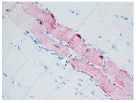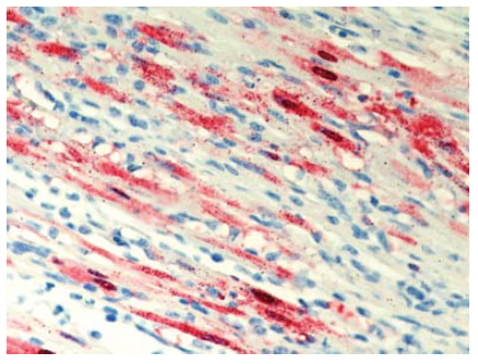 Gambar 13.9 Pewarnaan virus AI (warna merah) terdapat dalam sel miosit pada otot rangka anak itik berumur 2 minggu yang diinokulasi dengan virus HPAI H5N1 A/Crow/Thailand/04, yang dieuthanasi 4 hari setelah inokulasi. Foto diterbitkan dengan izin dari buku Avian Diseases. Hak cipta dipegang oleh American Association of Avian Pathologist, Athens, Georgia, USA. Sumber: USDA – M. Pantin-Jackwood [103]