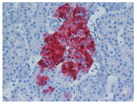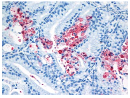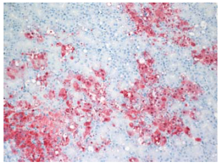 Gambar 13.8 Pewarnaan virus AI (warna merah) terdapat dalam sel kortikotropik dalam kelenjar adrenal anak itik berumur 2 minggu yang diinokulasi dengan virus HPAI H5N1 A/Vietnam/218/05, dua hari setelah inokulasi. Foto diterbitkan dengan izin dari buku Avian Diseases. Hak cipta dipegang oleh American Association of Avian Pathologist, Athens, Georgia, USA. Sumber: USDA – M. Pantin-Jackwood [103].