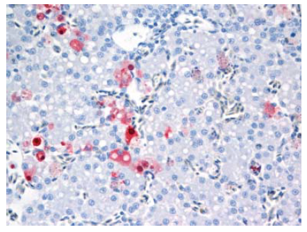 Gambar 13.13 Pewarnaan virus (warna merah) pada sel hepatosit dan sel Kupffer pada hati anak itik berumur 2 minggu yang diinokulasi dengan virus A/chicken/Egypt/08124S-NLQP/2008.