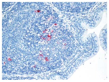 Gambar 13.14 Antigen virus AI (warna merah) pada sel fagosit lokal maupun sel fagosit yang melakukan inflitrasi jaringan dalam folikel bursa pada anak itik berumur 2 minggu yang diinokulasi dengan virus A/chicken/Egypt/08124S-NLQP/2008.