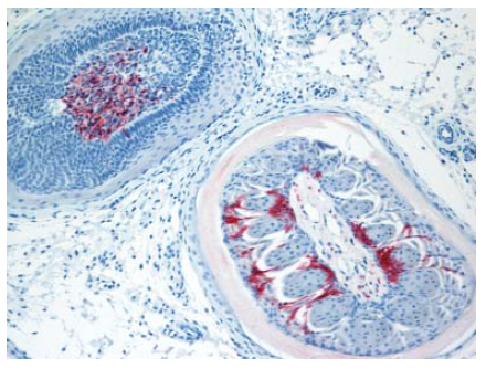 Gambar 13.15 Antigen virus AI (warna merah) pada sel epitelium dan pangkal bulu (pulp of feather) pada anak itik berumur 2 minggu yang diinokulasi dengan virus A/duck/Vietnamt/218/2005.