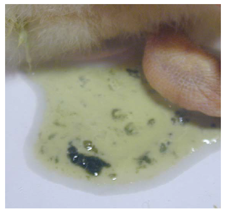 Gambar 13.3 Anak Itik Peking berumur dua minggu menunjukkan feses dengan kotoran berwarna empedu (bile-stained) pada hari ke-3 setelah inokulasi IN dengan virus HPAI H5N1 A/egret/HK/757.2/02. Foto diterbitkan dengan izin dari buku Avian Diseases. Hak cipta dipegang oleh American Association of Avian Pathologist, Athens, Georgia, USA. Sumber: USDA – M. Pantin-Jackwood [103].