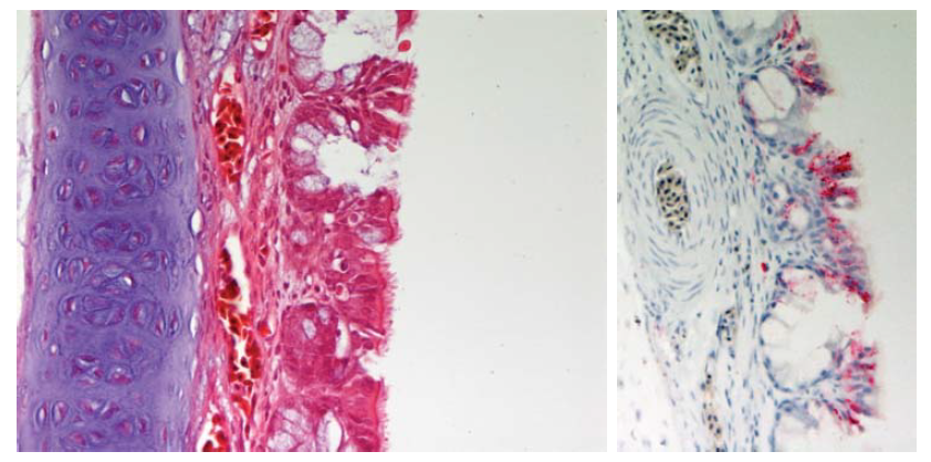 Gambar 13.5 Degenerasi dan nekrosis epitel trakea dengan eksudat mukoseluler yang mengandung sel epitel yang terkelupas pada trakea dari anak itik berumur 2 minggu yang ditemukan mati 4 hari setelah diinokulasi dengan virus HPAI H5N1 A/crow/Thailand/04. Inset. Pewarnaan antigen virus (warna merah) menunjukkan antigen virus terdapat pada sel epitel. Foto diterbitkan dengan izin dari buku Avian Diseases. Hak cipta dipegang oleh American Association of Avian Pathologist, Athens, Georgia, USA. Sumber: USDA – M. Pantin-Jackwood [103].