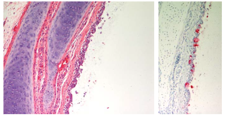 Gambar 13.11 Degenerasi vakuoler dan pewarnaan virus AI (warna merah) pada sel epitel kelenjar Harderian anak itik berumur 2 minggu yang diinokulasi dengan virus A/chicken/Egypt/08124S-NLQP/2008.
