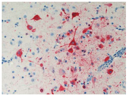 Gambar 13.7 Pewarnaan virus dengan nilai positif sangat kuat (warna merah) terdapat dalam sel neuron dalam cerebrum anak itik berumur 2 minggu yang diinokulasi dengan virus HPAI H5N1 A/Vietnam/1203/04 yang ditemukan mati 4 hari setelah inokulasi. Foto diterbitkan dengan izin dari buku Avian Diseases. Hak cipta dipegang oleh American Association of Avian Pathologist, Athens, Georgia, USA. Sumber: USDA – M. Pantin-Jackwood [103].