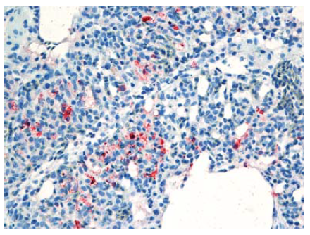 Gambar 13.10 Pewarnaan virus AI (warna merah) terdapat dalam sel fagosit dan epitel kapiler udara pada paru-paru anak itik berumur 2 minggu yang diinokulasi dengan virus A/chicken/Egypt/08124S-NLQP/2008.
