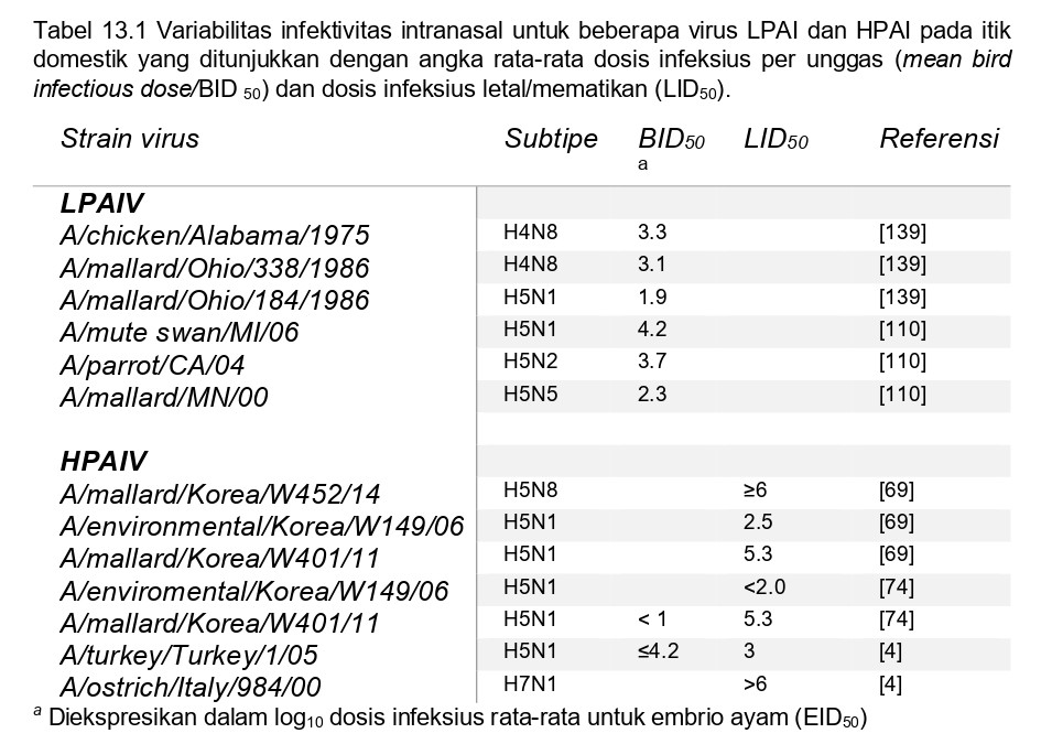 Beberapa faktor mempengaruhi biologi virus AI yang kompleks, meliputi infektifitas, adaptasi hospes, virulensi dan tropisme jaringan [104]. Meskipun patotipe LP maupun HP untuk virus AI didefinisikan dalam lingkungan laboratorium, infeksi alami virus AI mengakibatkan beragam gejala klinis yang tergantung pada banyak faktor, meliputi strain virus, spesies hospes, umur hospes, jenis kelamin hospes, infeksi yang terjadi bersamaan dengan infeksi AI, imunitas perolehan, dan faktor lingkungan [138]. Terdapat empat kemungkinan hasil akhir setelah terpapar virus AI, yaitu tidak terjadi infeksi, infeksi asimptomatik, penyakit ringan, atau penyakit berat dengan kematian [104]. Paparan, atau akses terhadap virus, sangat kritikal dalam memulai proses infeksi. Namun, untuk beberapa virus Ai dan beberapa hospes, paparan terhadap virus mungkin saja tidak menyebabkan infeksi, terutama jika rute paparannya tidak cocok, dosis virus berada dibawah ambang batas yang diperlukan untuk menginisiasi infeksi, terdapat kekebalan terhadap strain virus tersebut, atau strain virus itu tidak beradaptasi terhadap spesies hospes secara spesifik [104]. Doses infeksius rata-rata untuk beberapa virus AI yang telah didapatkan untuk beberapa spesies unggas domestik dibawah kondisi percobaan. Dosis ini terbukti tergantung baik kepada strain virus maupun hospesnya, dan dapat dianggap sebagai salah satu parameter dalam mengukur infektivitas dan adaptabilitas virus terhadap spesies hospes tertentu (Table 13.1) [139].