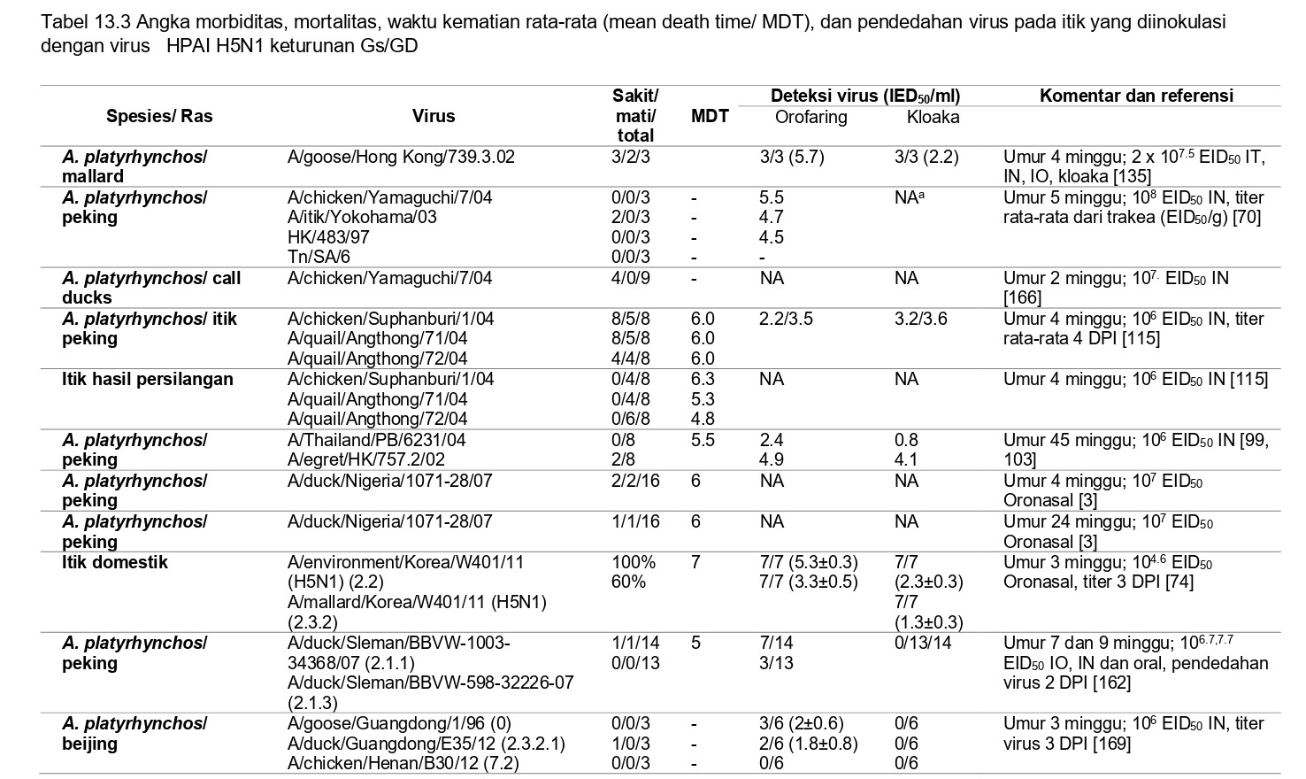 Sebuah studi perbandingan yang telah meneliti tentang pathogenesis virus HPAI H5N1 pada itik domestik dapat ditemukan pada Table 13.1 dan 13.3. Tabel 13.2 membandingkan patogenisitas virus HPAI H5N1 pada anak itik peking berumur 2 minggu yang diberi perlakukan dan kondisi percobaan yang sama. Tabel 13.3 membandingkan penelitian yang telah dilakukan oleh beberapa kelompok peneliti. Uji tantang terhadap virus ini maupun virus H5N1 lainnya juga telah dilakukan pada penelitian tentang vaksinasi [10, 13, 21, 22, 31, 41, 68, 83, 91, 108, 112, 114, 131, 132, 146, 148, 149, 158, 168], yang telah dibahas oleh Pantin-Jackwood dan Suarez [102].