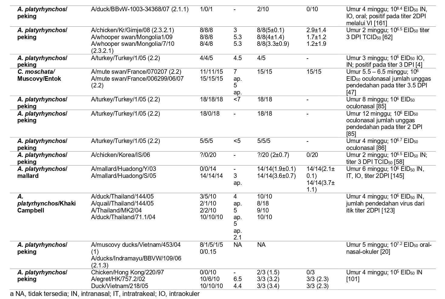 Itik Mallard telah terinfeksi dengan virus LPAI melalui berbagai rute inokulasi melalui pola pendedahan virus yang sangat serupa satu sama lain [44]. Entok dan Itik Peking juga telah teinfeksi dengan dua virus HPAI H5N1 yang memiliki virulensi berbeda saat diberikan melalui tiga rute – IN, intrakloka (IC), atau IO [97]. Tidak perduli lewat mana saja rute inokulasinya, hasil akhir infeksinya serupa untuk setiap spesies, dan tergantung kepada virus yang digunakan. Infeksi kedua jenis virus bersifat letal untuk Entok, akan tetapi hanya satu virus yang menyebabkan kematian tinggi pada itik Peking, yang sekali lagi menunjukkan adanya perbedaan yang jelas dalam patogenitas virus HPAI H5N1 untuk kedua spesies itik ini. Tidak perduli dimana tempat virus pertama kali bereplikasi, virus dengan cepat menjadi sistemik, dan memproduksi lesi dan perkembangan penyakit sampai titer virus yang tinggi pada jaringan [97].