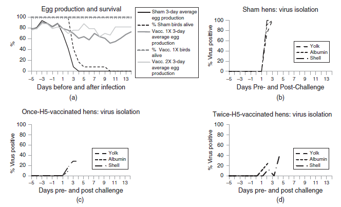 Gambar 15.1. Contoh metrik produksi yang berhubungan dengan unggas petelur menggunakan produksi telur (persentase telur/ekor/hari dengan rata-rata pengukuran 3 hari), kematian ayam betina (%), dan terkontaminasinya telur/positif virus pada permukaan kerabang, kuning telur dan albumin dari sampel (% positif virus) untuk populasi kontrol (sham) yang tervaksinasi dan ayam yang telah divaksin dengan vaksin H5 satu atau dua kali yang diuji tantang dengan virus HPAI A/chicken/Pennsylvania/1370/83 (H5N2). Swayne dkk., Vaccine 30(33):4964-4970, 2012 [11]. Digunakan dengan izin dari Elsevier.