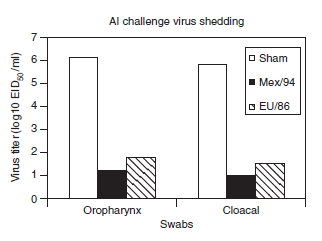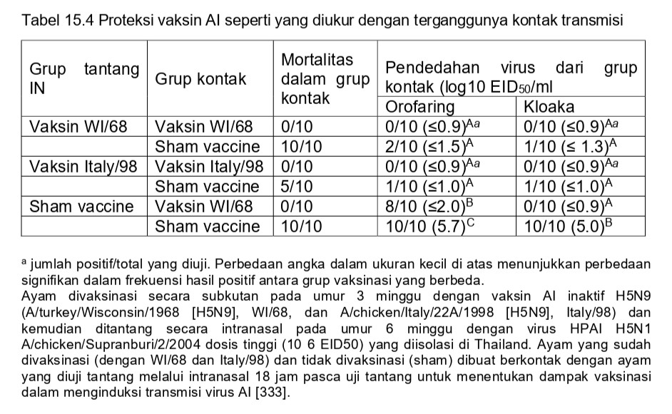 Baik untuk virus LPAI maupun HPAI, pencegahan infeksi atau reduksi replikasi virus secara kualitatif dan/atau kuantitatif dalam saluran respirasi dan digesti, adalah kriteria proteksi yang secara tidak langsung mengukur peranan vaksin dalam membatasi kontaminasi lingkungan dan persebaran virus di lapangan (Tabel 15.3 dan Gambar 15.2) [2, 29, 41, 165, 249, 304, 341]. Berkurangnya replikasi virus yang diuji tantang dapat dikuantifikasi menggunakan cara klasik isolasi virus dan metode titrasi dalam telur ayam berembrio (ECE) atau sistem kultur jaringan [18, 63, 52, 322, 23, 328], atau dengan pengujian asam amino spesifik secara kuantitatif ataupun kualitatif, seperti misalnya dengan. RRT-PCR [304, 322], atau dengan mendemonstrasikan protein virus AI, misalnya dengan uji ELISA [152, 189]. Demonstrasi berkurangnya replikasi dan titer pendedahan virus dari saluran pernafasan dan harus menunjukkan nilai minimum 10 2 EID (100 kali) lebih sedikit virus pada hewan tervaksinasi dibandingkan dengan unggas yang belum divaksinasi [177], atau perbedaan harus dianalisis untuk melihat signifikansinya secara statistik [314]. Badan perizinan terkait biologi veteriner nasional mungkin memerlukan demonstrasi bahwa berkurangnya jumlah virus terdedah relevan secara klinis (misalnya bahwa baik pendedahan virus maupun kontak transmisi dapat dikurangi dalam studi eksperimental). Selain itu, unggas yang sudah divaksinasi memiliki resistensi yang dapat diukur secara kuantitatif terhadap induksi infeksi yang terukur dengan angka dosis uji tantang sebesar lebih besar dari 10 32- 10 5 EID50 untuk dapat menimbulkan infeksi pada unggas yang sudah divaksinasi jika dibandingkan dengan unggas yang tidak divaksinasi, dan resistensi semacam itu dapat dipergunakan sebagai alat ukur proteksi. Akan tetapi, eksperimen yang harus dilakukan sangat besar dan memerlukan biaya mahal [322]. Di antara berbagai metrik proteksi yang teramati pada studi eksperimental, vaksin AI harus berulang kali dapat menunjukkan bukti dapat mencegah kematian, diikuti dengan mencegah munculnya gejala klinis, dan kemudian pecegahan atau pengurangan replikasi dan pendedahan virus dari saluran makanan, dan paling sulit untuk didemonstrasikan adalah pencegahan replikasi virus dan pendedahannya dari saluran pernafasan. Reduksi pendedahan semacam itu dicapai paling baik jika hemaglutinin virus dalam vaksin dan virus tantang secara genetik dan antigenik berhubungan dekat. [45, 63]. Penurunan produksi telur adalah yang paling sulit dicegah di antara metrik morbiditas lainnya. Baru-baru ini, saat menilai proteksi yang diberikan vaksin inaktif pada ayam setelah terkena virus LPAI, reduksi protein fase akut serum dihubungkan dengan berkurangnya pendedahan strain virus dari orofaring [152, 294, 295, 325].