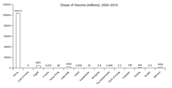Contoh lain vaksinasi darurat dan preventif melawan LPAI dilakukan di Italia Utara, dimana sejumlah 202.140.000 dosis vaksin AI digunakan antara bulan November 2002 dan Desember 2006, kebanyakan pada ayam petelur dan kalkun pedaging, juga beberapa capon (ayam jantan yang dikebiri untuk digemukkan), ayam guinea dan ayam jantan. Kebanyakan vaksin AI adalah H7 inaktif yang digunakan dalam kampanye vaksinasi darurat melawan LPAI, tetapi ada juga beberapa vaksin bivalen H5 dan H7 yang digunakan selama 2005 dan 2006 untuk kampanye pencegahan LPAI [223]. Sebagai contoh vaksin influenza rutin, virus influenza babi (SIV) menyebabkan infeksi dan kerugian ekonomi breeder kalkun yang terletak di negara bagian tertentu di Amerika Serikat dimana babi dan kalkun dibesarkan dalam area geografis yang sama. Sebagai contoh, vaksin influenza A H1 inaktif yang digunakan untuk breeder kalkun di Amerika dilaporkan sebesar 2.6 juta dosis di tahun 2001 dan 7.965 dosis di tahun 2009, untuk melindungi terhadap virus SIV H1 atau H3 [50]. Akan tetapi, penggunaan vaksin AI inaktif paling ekstensif adalah di Timur Tengah dan Aisa, dimana sejak akhir tahun 1990-an milyaran dosis telah digunakan pada ayam petelur, pedaging dan unggas lainnya.