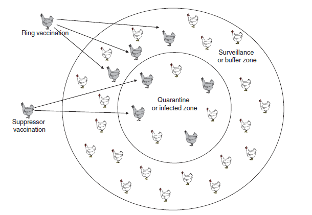 Berbagai strategi telah diajukan untuk menggunakan vaksin sebagai bagian program pengendalian baik HPAI maupun LPAI [105]. Dalam sejarahnya, vaksinasi melawan penyakit eksotik seperti misalnya penyakit mulut dan kuku (PMK) dan rinderpest pada hewan ternak besar telah dilakukan dengan strategi vaksinasi cincin – yaitu vaksinasi zona kontrol atau zona surveilans di sekeliling wilayah wabah, yang didasarkan pada konsep epidemiologi pergerakan jarak dekat hewan ternak besar yang terinfeksi (misalnya sapi dan babi) dan bahan tercemar (fomite) yang mengandung virus (Gambar 15.4). vaksinasi cincin telah diajukan sebagai program vaksinasi darurat untuk pengendalian HPAI, akan tetapi strategi semacam itu tidak selamanya sepenuhnya efektif karena mudahnya perpindahan unggas kecil melalui jarak yang jauh dari dan ke dalam sistem pasar unggas hidup, terutama di negara-negara berkembang dimana unggas berukuran kecil dapat dibawa dengan mudah dalam kandang-kandang kecil yang dicantelkan pada sepeda motor dan dibawa dari peternakan ke pasar dan sebaliknya. Strategi lainnya yaitu vaksinasi ‘supresor’ dalam zona wabah HPAI yang diberlakukan kepada flok yang belum terinfeksi untuk meningkatkan resistensi flok-flok tersebut terhadap virus AI, dan juga pada flok terinfeksi terutama dengan virus LPAI untuk menginduksi level imun tinggi yang konsisten dengan tujuan menghentikan pendedahan dan transmisi virus (Gambar 15.4). Yang disebutkan terakhir dapat memberikan manfaat tambahan yaitu menghentikan persebaran virus AI dalam peternakan, bahkan dalam kandang yang sudah terinfeksi, seperti yang telah ditunjukkan dalam percobaan vaksinasi di lapangan melawan virus HPAI H5N2 di Pennsylvania selama tahun 1983 dan melawan virus HPAI H5N1 di Hong Kong selama tahun 2002 [58, 61, 64-67, 137, 139, 192, 218, 314, 328, 330]. Sebagai alternatif vaksinasi supresor dapat digunakan selama repopulasi dengan menempatkan unggas yang sudah divaksin kembali ke lingkungan pemeliharaan dimana masih terdapat kantong-kantong residu virus yang berisiko di lingkungan tersebut yang tidak dapat dibersihkan dan didesinfeksi secara tuntas, atau di wilayah-wilayah dengan tingkat infeksi rendah yang tidak terdeteksi pada unggas pedesaan yang sulit dijangkau. Repopulasi dengan unggas yang sudah divaksin harusnya dapat mengurangi potensi kemunculan kembali virus AI. Strategi vaksinasi serupa dapat digunakan untuk pengendalian LPAI. Untuk kasus LPAI, vaksinasi dipraktikkan pada beberapa peternakan ayam petelur terdampak yang memiliki beberapa kandang ayam berukuran besar yang mengalami infeksi virus LPAI H7N2 di Connecticut, Amerika Serikat selama tahun 2003 sampai 2005 [105, 106]. Dalam situasi ini virus LPAI tidak memproduksi infeksi secara konsisten kepada semua ayam di dalam kandang berukuran besar, dan vaksinasi kemudian diberlakukan untuk meningkatkan imunitas keseluruhan ayam dalam level yang konsisten dan protektif yang memungkinkan produksi dan pemasaran telur unggas yang aman dari virus. Setelah 18 bulan, seluruh ayam yang sudah divaksin dalam kandang terdampak kemudian diafkir, dan tidak ada virus LPAI H7N2 yang terdeteksi selama surveilans [314].