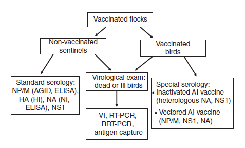 Akan tetapi, surveilans serologis hanya harus dilakukan jika sampel dengan jumlah mencukupi dan tepat telah dikoleksi dari sub populasi unggas yang tepat dan diuji dengan metodologi laboratoris yang tepat pula. Sebagai contoh, sampling unggas sakit atau mati, dimana biasanya terdapat ekskresi virus dalam jumlah banyak dari orofaring dan/atau kloaka, telah menunjukkan deteksi virus yang konsisten, baik LPAI maupun HPAI dengan menggunakan isolasi virus, RRT-PCR, atau deteksi antigen dengan berbagai metode uji ELISA penangkap antigen [314]. Akan tetapi, sampling unggas terinfeksi yang bersifat pre klinis, dimana pendedahan virus masih rendah, hanya akan mendeteksi virus jika menggunakan metode yang paling sensitif (misalnya isolasi virus dan RRT-PCR). Penggunaan uji penangkap antigen telah menunjukkan 79-80% sensitivitas dan 99-100% sensitivitas dalam mendeteksi virus dalam sampel yang berasal dari ayam yang sakit atau mati karena virus LPAI [91, 283]. Uji RRT-PCR memiliki 95% sensitivitas dan 99% spesifisitas untuk data yang sama. Karena itulah, untuk meningkatkan sensitivitas deteksi unggas terinfeksi, koleksi dan pengujian rutin harian unggas yang mati atau yang terlihat sakit harus digunakan untuk memonitor secara virologi kelompok unggas yang sudah divaksin untuk menjaga kemungkinan infeksi virus AI, dan uji virologi yang paling sensitif harus dipergunakan. Sebagai contoh surveilans virologi yang dilakukan di Mesir tahun 2007-2008, yang melibatkan unggas komersial maupun unggas belakang rumah mengidentifikasi virus AI di 35 peternakan dari 3610 peternakan (0.97%) pada tahun 2007 dan 27 peternakan dari 8682 peternakan (0.31%) pada tahun 2008 khusus peternakan unggas komersial, dan 246 peternakan dari 816 peternakan (30%) pada tahun 2007 dan 89 dari 1723 peternakan (5.2%) khusus flok unggas belakang rumah. Hal ini mengindikasikan rendahnya level infeksi virus dalam populasi yang sudah divaksin [93, 94, 283, 408]. Akan tetapi virus HPAI H5N1 bersifat endemik di Mesir dikarenakan rendahnya capaian vaksinasi nasional [134] dan penggunaan vaksin dengan kecocokan antigenik yang rendah [338, 339].
