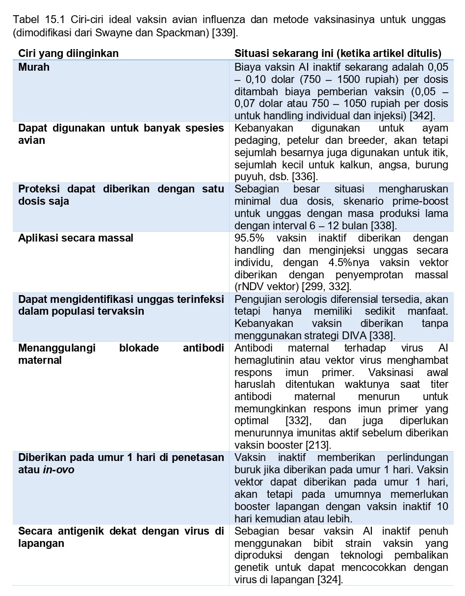 Vaksin AI ideal adalah yang secara antigenik memiliki kedekatan dengan virus yang ada di lapangan untuk memberikan perlindungan terbaik, dapat digunakan untuk banyak spesies unggas, cocok dengan perlindungan dosis tunggal, dapat dengan mudah diberikan secara massal kepada populasi unggas yang besar, cocok dengan metode yang memudahkan identifikasi unggas terinfeksi dalam populasi yang sudah terinfeksi (misalnya strategi DIVA yang digunakan untuk membedakan hewan terinfeksi dengan yang divaksinasi), dapat mengatasi blokade antibodi maternal untuk menimbulkan respons imun aktif, mungkin dapat diberikan dalam penetasan pada umur satu hari atau in-ovo, dan juga tidak mahal (Tabel 15.1) 116, 117, 342]. Saat mengembangkan vaksin yang baru karakteristik ini harus dipertimbangkan, karena vaksin tampaknya tidak mungkin untuk dikembangkan dalam pemasaran kecuali jika mengandung karakteristik ‘ideal jika dibandingkan dengan vaksin AI yang telah diizinkan untuk unggas sebelumnya. Hal ini membutuhkan peneliti yang memiliki pengetahuan praktis tentang bagaimana produksi unggas di negara yang melisensi vaksin, dan bagaimana dilakukan manajemen permasalahan kesehatan unggas terkait di lapangan di negara-negara dan wilayah yang berbeda. Sebagai tambahan, pembaca harus menerima bahwa karakteristik ideal dari vaksin influenza manusia tidak akan menjadi ideal untuk vaksin AI unggas. Selain itu, pembaharuan teknologi vaksin yang baru masih belum cukup untuk dapat digunakan (misalnya teknologi baru yang ada harus dapat dipraktikkan). Tidak ada satu pun vaksin AI yang telah diberikan izin edar telah memenuhi seluruh kriteria vaksin ideal, karena itu masih banyak ruang untuk inovasi dan perbaikan.