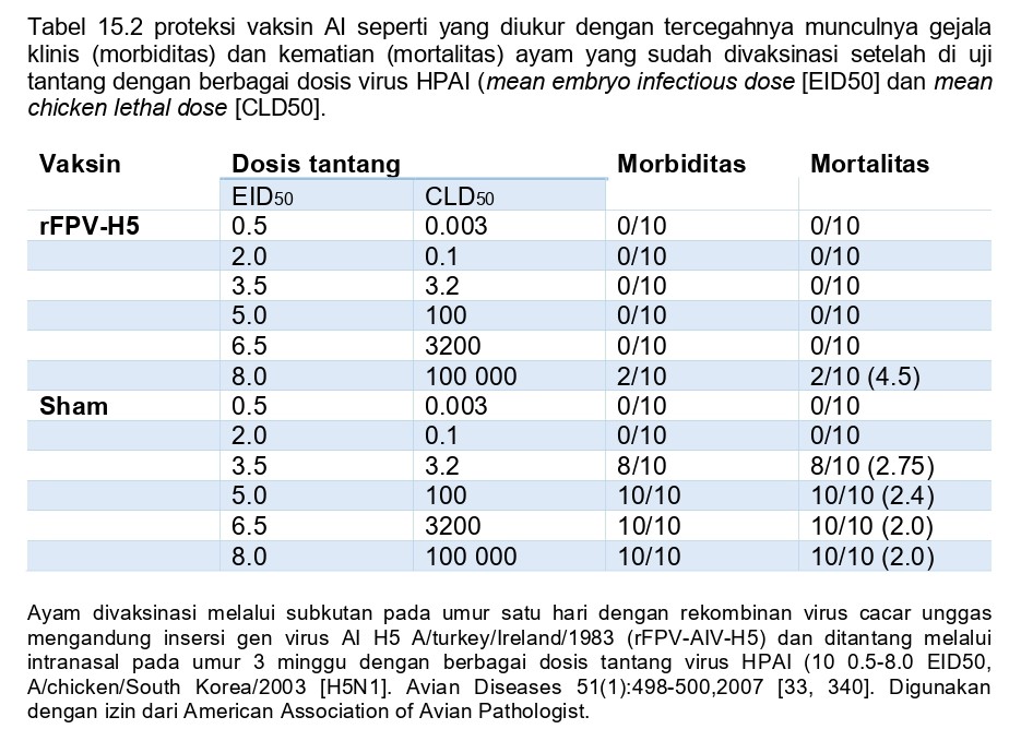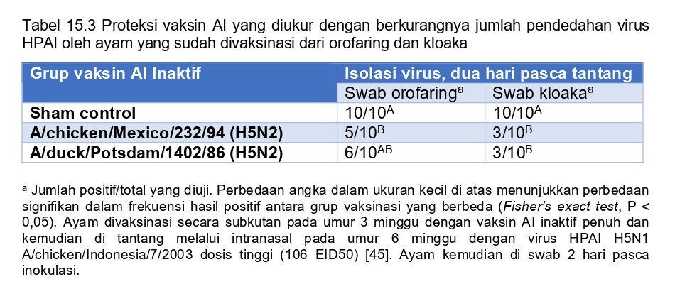 Tabel 15.3 Proteksi vaksin AI yang diukur dengan berkurangnya jumlah pendedahan virus HPAI oleh ayam yang sudah divaksinasi dari orofaring dan kloaka