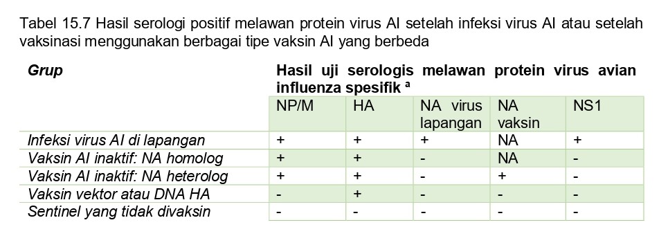 Monitoring serologis memberikan pandangan sejarah infeksi dalam satu flok, yang dapat dipergunakan untuk menilai kesuksesan program vaksinasi, akan tetapi tidak dapat digunakan untuk mengidentifikasi flok yang terinfeksi secara aktif. Surveilans virologi diperlukan untuk menentukan apakah flok saat ini sedang terinfeksi dan risiko apa, jika ada, yang dimiliki oleh flok sebagai reservoir virus, dan risiko transmisinya. Berbagai sistem surveilans serologis telah dijelaskan, masing-masingnya memiliki keuntungan dan kerugian spesifik, akan tetapi tidak ada hanya satu sistem saja yang akan berguna untuk semua jenis vaksin dan semua situasi di lapangan. Seluruh sistem surveilans serologis didasarkan pada produksi antibodi yang berbeda melawan beragam protein virus setelah infeksi virus AI jika dibandingkan dengan vaksinasi (Tabel 15.7).