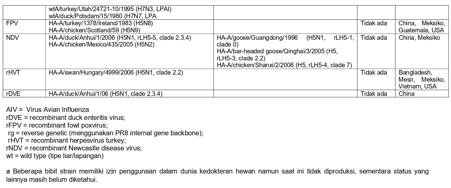 - Strain vaksin haruslah menggunakan sub tipe HA yang sama dan harus bersifat protektif untuk spesies target berdasarkan studi in-vivo melawan virus yang bersirkulasi di lapangan,