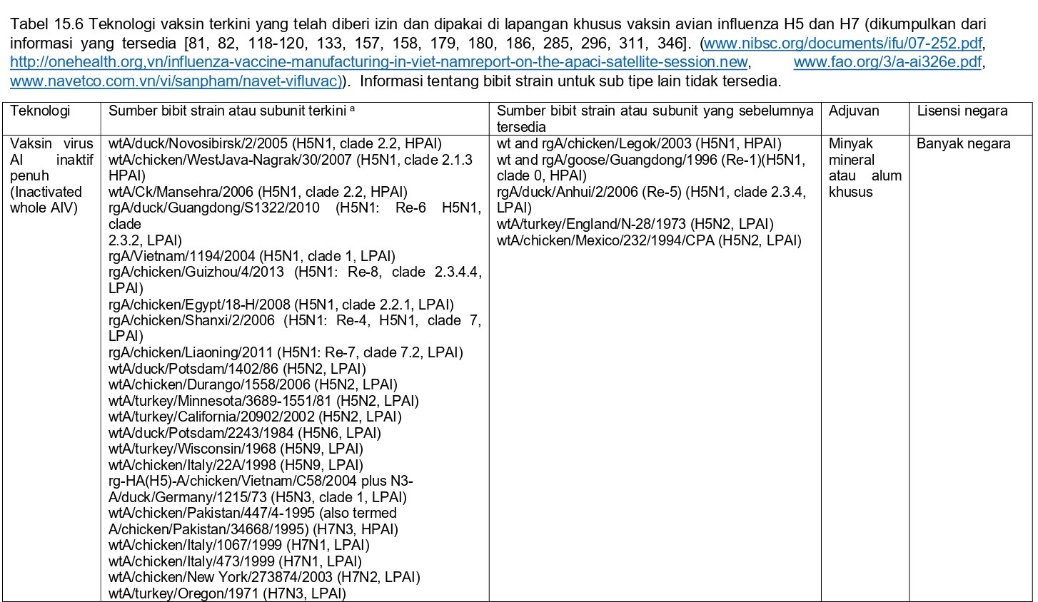 Kuantitas vaksin AI yang telah diproduksi dan digunakan pada unggas sebelum dua dekade terakhir pencatatannya sangat buruk, akan tetapi penggunaan global masih tetap rendah sampai pertengahan tahun 1990-an, dan kemudian pembuatan vaksin meluas secara geometris pada dekade awal abad 21. Untuk vaksin H5 dan H7, survei yang dilakukan pada awal tahun 2002 mengidentifikasi hanya ada dua perusahaan pembuat diantara negara anggota OIE yang merespons terhadap survei tersebut, akan tetapi di tahun 2006 dan 2007 OIE membuat daftar 38 perusahaan pembuat vaksin AI, dan FAO dari PBB membuat daftar 41 jenis vaksin AI untuk digunakan untuk melawan HPAI H5 dan H7 yang tersedia dari China, Perancis, Jerman, Italia, Meksiko, Belanda, Pakistan dan Amerika Serikat [125]. Sampai 2012, hanya 27 perusahaan vaksin dikenali sebagai produsen vaksin AI H5 dan H7 [220, 239, 268]. Karena LPAI H1-H4, H6, H8, dan H10 bukan merupakan penyakit yang harus dilaporkan kepada OIE atau kebanyakan otoritas negara, hanya sedikit yang diketahui tentang ketersediaan dan penggunaan vaksin untuk pengendaliannya. Akan tetapi, vaksin yang menggunakan bibit strain vaksin LPAI H9N2 telah digunakan secara rutin pada unggas komersial di 10 negara yang tersebar di Timur Tengah dan Asia [73]. Tabel 15.6 berisi daftar strain bibit yang saat ini tersedia dan yang telah diproduksi di masa lalu tetapi tidak lagi tersedia.