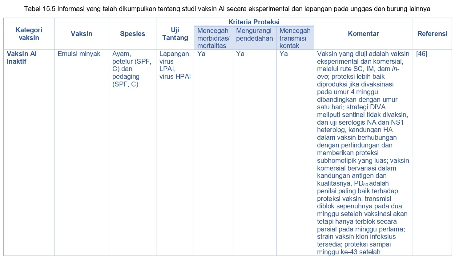 Kebanyakan vaksin AI yang diregistrasi dan digunakan di lapangan adalah vaksin AI inaktif penuh diberikan izin untuk diberikan secara parenteral (subkutan atau intramuskuler) (Tabel 15.5) [330]. Vaksin non-replikasi semacam itu dipilih karena faktor keamanan pada hospes konvensional maupun hospes dengan kondisi imun yang lemah. Akan tetapi, dalam rangka menginduksi kekebalan protektif, vaksin inaktif memerlukan injeksi antigen dalam jumlah banyak, dan penambahan adjuvan sangat memicu proses immunogenik [338]. Rute dan waktu vaksinasi akan mempengaruhi immunogenik dan efikasi respons imun terhadap vaksin. Sering kali vaksin AI dikombinasikan dengan vaksin virus lainnya maupun bakteri dan diberikan berturut-turut dalam waktu yang sudah di tentukan secara spesifik dalam masa hidup unggas, dan permasalahan logistik terkait hal itu haruslah dipertimbangkan saat mengembangkan program pengendalian AI. Banyak studi eksperimental telah menggambarkan efikasi vaksin AI inaktif pada spesies Avian (Tabel 15.5).
