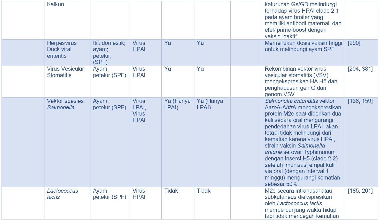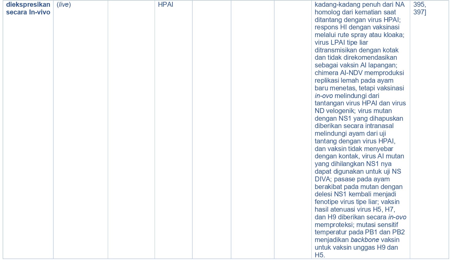 Baru-baru ini, vektor Salmonella enteritidis ∆aroA dengan insersi gen AI-M2e dapat memproduksi antibodi penetralisir setelah dilakukan dua kali vaksinasi melalui saluran makanan pada ayam, dan juga mampu mengurangi replikasi dan pendedahan virus setelah ditantang dengan virus LPAI H7N2, tetapi tidak melindungi terhadap kematian karena uji tantang virus HPAI H5N1 [89]. Serupa dengan itu, hiperekspresi M2e pada E coli hanya memberikan proteksi parsial pada ayam terhadap virus HPAI H5N1 [85, 185]. Sebaliknya, strain vaksin Salmonella enterica serovar Typhimurium mengekspresikan gen HA H5 yang diberikan secara oral dalam interval 4 minggu, memberikan proteksi parsial akan tetapi tidak memberikan proteksi penuh terhadap kematian akibat uji tantang virus HPAI homolog dan heterolog [404].