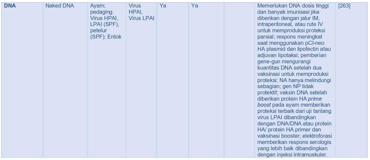 Vaksin DNA berbasis plasmid eksperimental menggunakan gen HA telah memicu respons imun protektif pada ayam melawan berbagai virus HPAI H5 dan H7 [22, 88, 327]. Vaksin semacam itu memproduksi antigen in situ, meliputi induksi imunitas humoral dan selular adaptif serupa dengan respons yang ditimbulkan oleh infeksi virus hidup atau vaksinasi [188, 179, 180, 203, 265, 311]. Umumnya, vaksin DNA merupakan asam nukleat telanjang mengandung virus AI cDNA dalam plasmid di bawah kendali gen promotor mamalia [192]. Penelitian pada mamalia telah menunjukkan bahwa vaksin DNA mengekspresikan gen HA memproduksi proteksi yang lebih efektif melawan varian antigenik virus influenza dibandingkan dengan vaksin inaktif, dan inklusi gen NP semakin menambah proteksi [118, 179, 311]. Akan tetapi, proteksi yang diinduksi oleh vaksin DNA pada model avian (misalnya ayam) tidak begitu konsisten dan memerlukan lebih banyak vaksinasi daripada proteksi yang ditimbulkan vaksin AI inaktif penuh atau vaksin subunit ekspresi AH in-vitro atau in-vivo [192, 311]. Limitasi utama penggunaan vaksin DNA untuk unggas adalah dibutuhkannya asam nukleat berharga mahal dalam jumlah banyak per dosisnya untuk memproduksi imunitas protektif pada ayam, dan kenyataan bahwa proteksi hanya bisa dicapai setelah 3 kali vaksinasi atau lebih. Vaksin DNA tetap tidak bisa digunakan dengan alasan ekonomi di lapangan kecuali sampai promotor berhasil dikembangkan untuk mengurangi jumlah imunisasi dan kuantitas asam nukleat yang diperlukan per ekornya. Pada studi eksperimental, vaksinasi tunggal vaksin DNA memberikan proteksi yang sama efektifnya dengan vaksin berbasis protein, yang merupakan standar perizinan. Baru-baru ini, perkembangan dalam vaksinasi DNA telah ditunjukkan dalam beberapa studi eksperimental. Primer DNA diikuti dengan booster protein virus AI lebih efektif jika dibandingkan dengan strategi primer/booster dengan menggunakan hanya vaksin DNA saja pada ayam [180, 192, 261, 311], dan penggunaan sitokin spesifik secara bersamaan dengan vaksin DNA memperbaiki respons imunologi jika dibandingkan hanya menggunakan vaksin DNA saja [120].