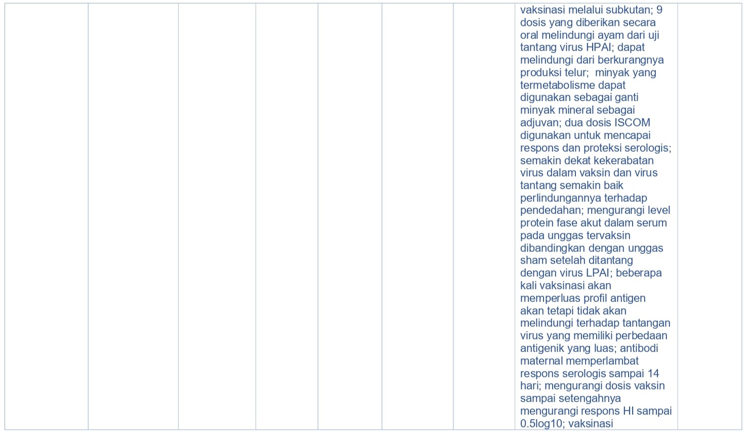 - Adjuvan. Penggunaan adjuvan minyak tambahan adalah hal yang umum dalam vaksin unggas inaktif, termasuk vaksin AI, dan memproduksi respons imun protektif jangka panjang yang lebih kuat dan luas daripada vaksin non-adjuvan [322, 323, 391].
