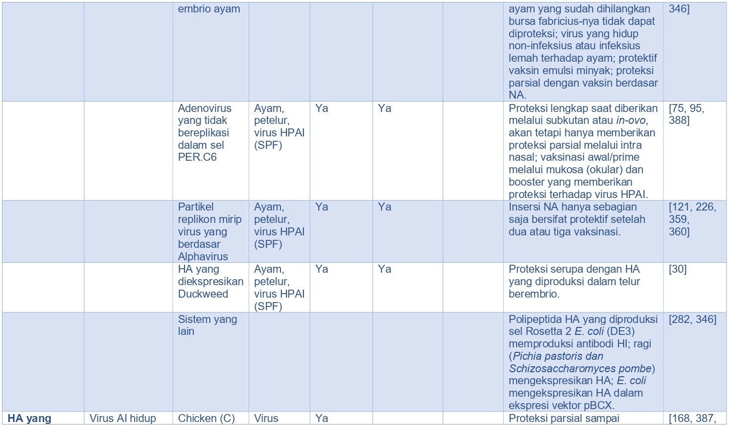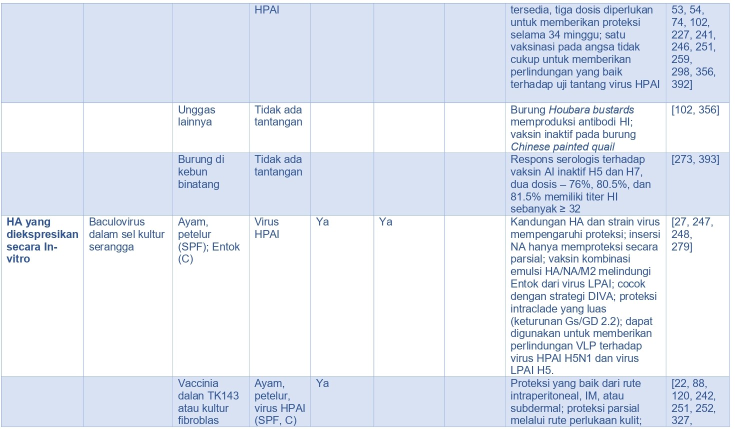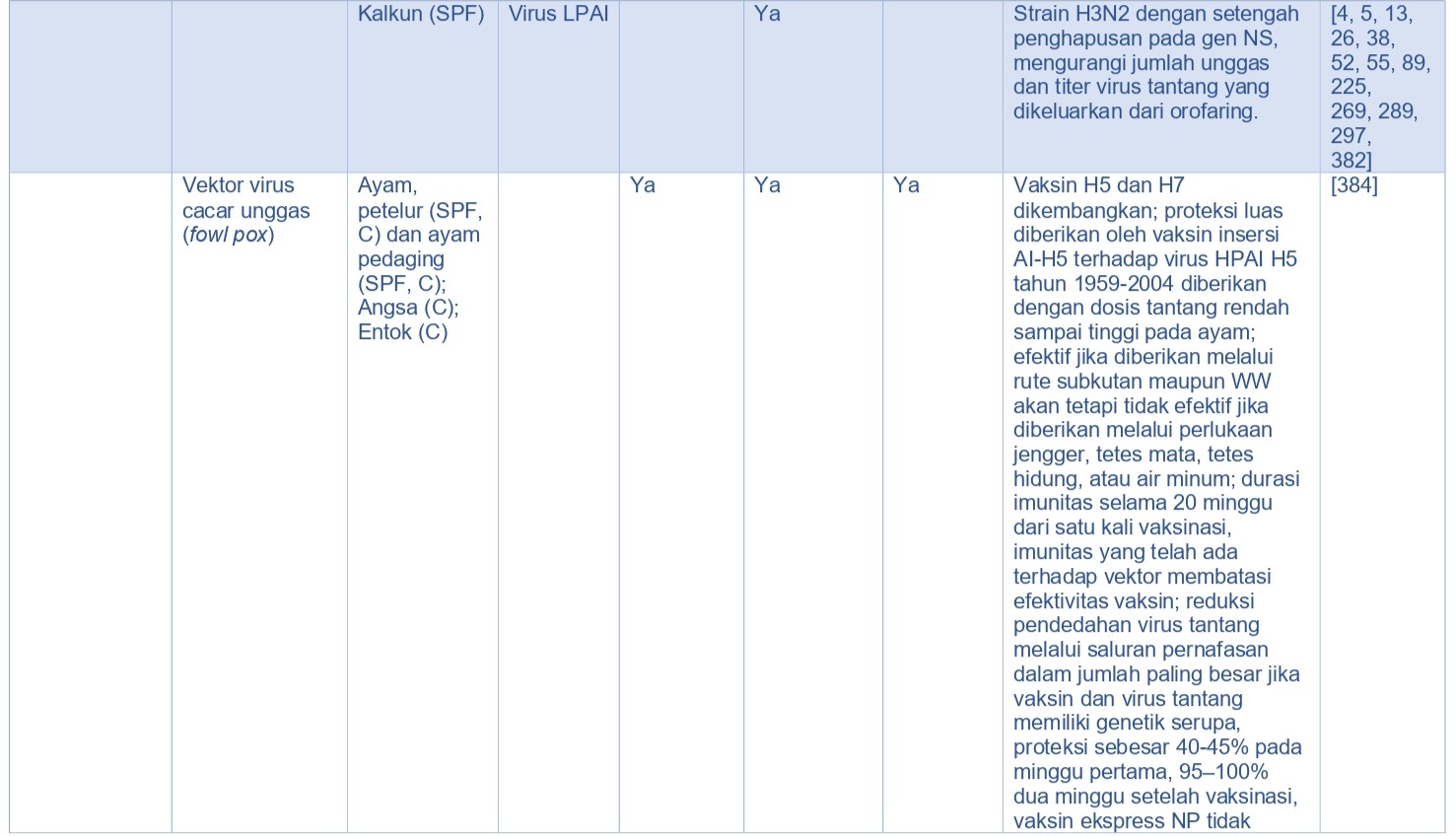 - Rute pemberian vaksin. Virus AI inaktif dan vaksin rekombinan cacar unggas (rFPV) dan vaksin rekombinan virus herpes kalkun (rHVT) dengan insersi gen H5 AI (rFPV-H5 dan rHVT-H5), memerlukan pemberian vaksin secara parenteral, sementara beberapa vaksin vektor yang hidup (live) seperti rekombinan virus Newcastle Disease (rNDV) dengan insersi gen virus AI H5 (rNDV-H5), dapat diberikan melalui rute topikal massal seperti melalui spray/semprot atau melalui air minum untuk memperoleh proteksi. rFPV-H5, rHVT-H5, dan vaksin lainnya memiliki potensi aplikasi melalui in-ovo [322].