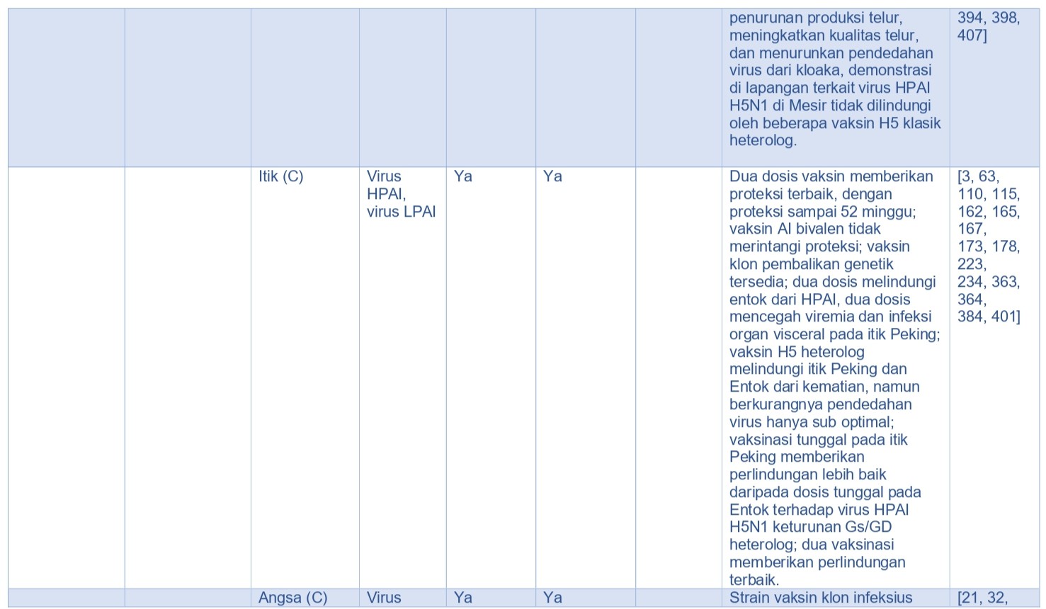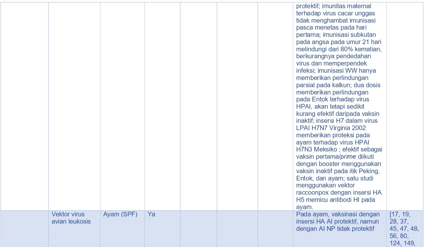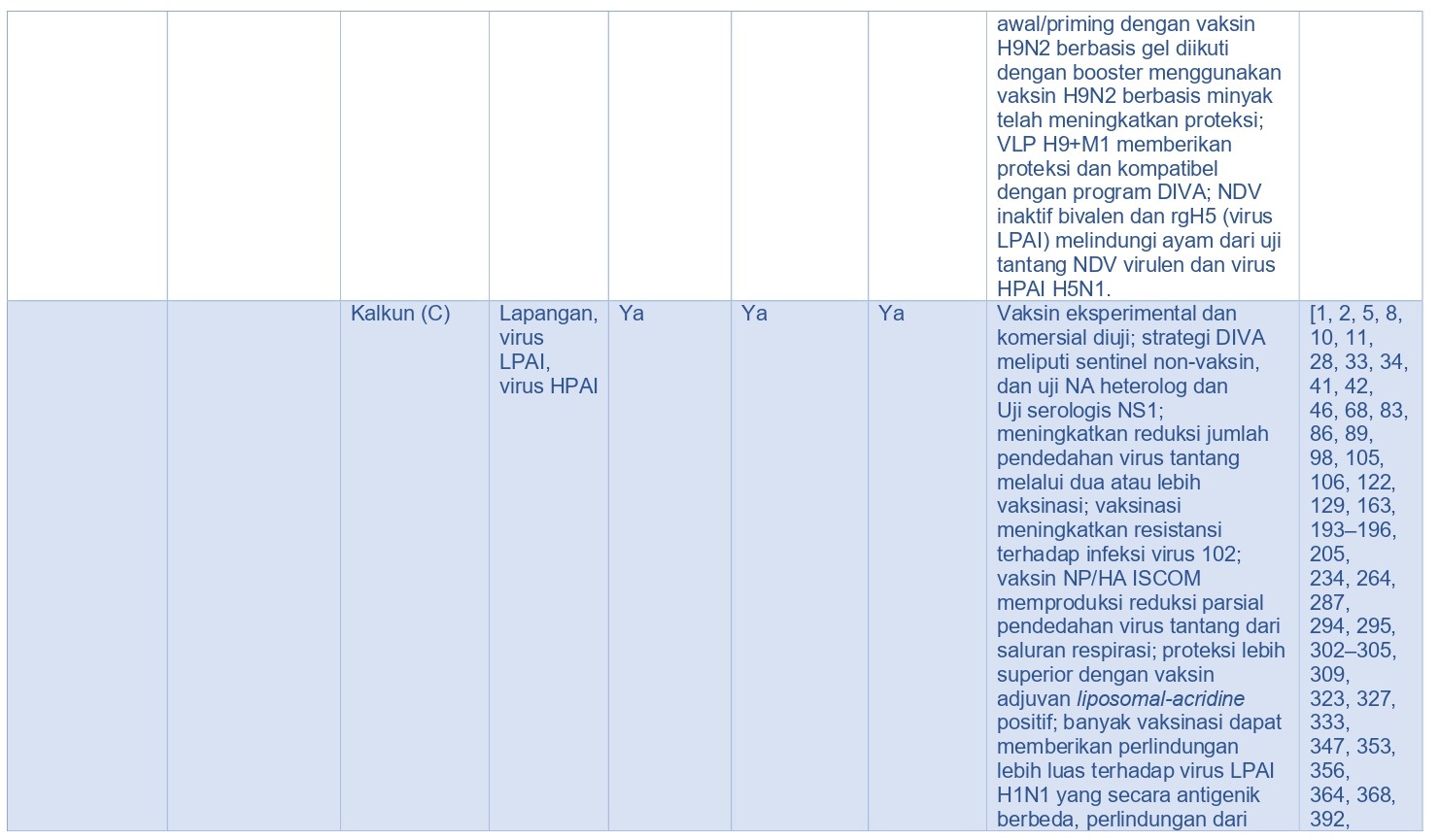 - Rute pemberian vaksin. Virus AI inaktif dan vaksin rekombinan cacar unggas (rFPV) dan vaksin rekombinan virus herpes kalkun (rHVT) dengan insersi gen H5 AI (rFPV-H5 dan rHVT-H5), memerlukan pemberian vaksin secara parenteral, sementara beberapa vaksin vektor yang hidup (live) seperti rekombinan virus Newcastle Disease (rNDV) dengan insersi gen virus AI H5 (rNDV-H5), dapat diberikan melalui rute topikal massal seperti melalui spray/semprot atau melalui air minum untuk memperoleh proteksi. rFPV-H5, rHVT-H5, dan vaksin lainnya memiliki potensi aplikasi melalui in-ovo [322].