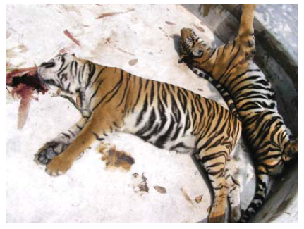 Gambar 23.1 Infeksi alami virus HPAI H5N1 pada harimau di Sri Racha, Thailand pada tahun 2004. Hewan yang terdampak mengalami demam tinggi, gangguan pernafasan, dan (pada beberapa kasus) gejala syaraf, dan mati dengan leleran hidung serosanguinus. Hak milik fotografi milik Dr. Roongroje Thanawongnuwech, Chulalongkorn University, Thailand.
