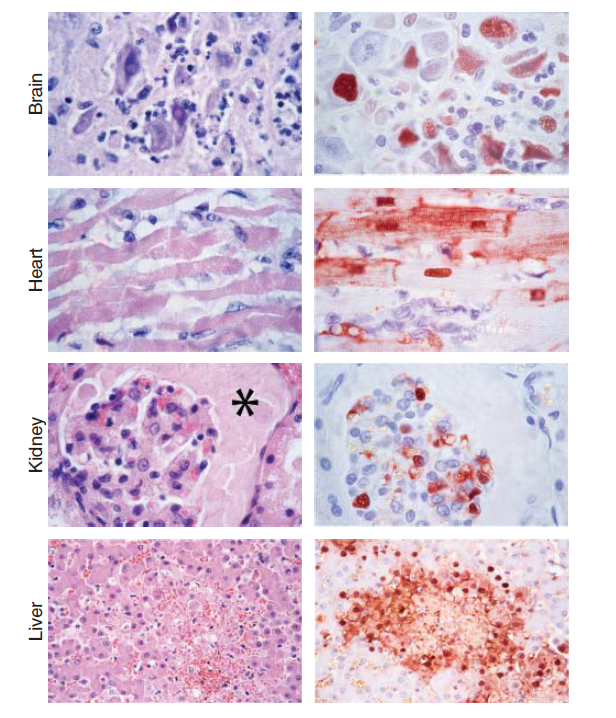 Gambar 23.2 Lesi histologi sistemik pada kucing domestik setelah infeksi eksperimental virus HPAI H5N1. Kolom sebelah kiri menunjukkan foci radang nekrotik yang terdapat pada banyak jaringan yang diwarnai dengan hematoksilin dan eosin. Kolom sebelah kanan menunjukkan antigen virus influenza (pewarnaan merah-coklat) yang ditemukan pada beberapa sayatan bagian dari jaringan yang sama, diwarnai untuk nukleoprotein menggunakan immunohistokimia. Dicetak ulang dari The American Journal of Pathology, January 2006, Vol. 168, No. 1, pp. 176–183, Rimmelzwaan G. F., van Riel D., Baars M., Bestebroer T. M., van Amerongen G., Fouchier R.A., Osterhaus, A. D., Kuiken, T. Influenza A virus (H5N1) infection in cats causes systemic disease with potential novel routes of virus spread within and between hosts. Dengan izin dari Elsevier.