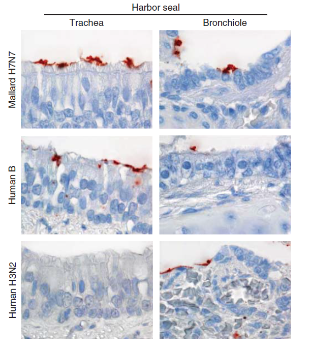 Kemampuan virus AI avian untuk menular dengan efisien di antara anjing laut pelabuhan dan menyebabkan kematian yang tinggi bersifat tidak biasa. Untuk menginvestigasi hal ini, Rami dan koleganya menentukan pola berikatannya virus AI pada saluran pernafasan anjing laut pelabuhan (Gambar 23.3). Mereka menemukan ikatan virus AI avian yang berlebihan kepada sel bronkial an epitel, yang konsisten berkorelasi dengan efisiensi penularan antar anjing laut. Dalam studi yang sama, mereka juga menemukan berikatannya virus AI yang langka yaitu berikatan dengan sel epitel bronkiolar dan alveolar anjing laut pelabuhan [182]. Hal ini sejalan dengan ditemukannya ekspresi reseptor SA𝛂2,3 yang biasanya jarang ditemukan di dalam paru-paru anjing laut pelabuhan [9]. Temuan ini tidak sesuai dengan laporan tingginya mortalitas anjing laut pelabuhan [65, 114, 239], meskipun konsisten dengan patogenitas rendah yang terlihat dalam infeksi eksperimental virus AI H7N7 pada anjing laut pelabuhan [65]. Salah Satu penjelasan yang mungkin adalah bahwa epidemi alami virus AI avian pada anjing laut pelabuhan diperparah dengan angen lain yang berko-infeksi seperti misalnya spesies Mycoplasma [65].
