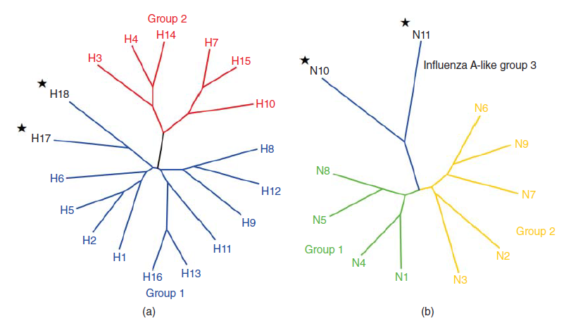 Analisis filogenetik dari sekuensing genetik primer molekul HA dari virus AI H17 dan H18 dari kelelawar mengindikasikan bahwa mereka termasuk ke dalam kelompok HA 1 (bersama H1, H2, H5, H6, H8, H9, H11, H12, H13, dan H16), dan tidak termasuk ke dalam grup HA 2 (H3, H4, H8, H10, H14, dan H15). N10 dan N11 dengan molekul mirip NA yang lebih bervariasi tidak termasuk kedalam grup NA 1 dan 2 yang ada, akan tetapi dikategorikan ke dalam grup 3 mirip influenza A (Gambar 23.4) [242]. Meskipun gen-gen internalnya hampir mirip dengan virus AI lain yang sudah dikenal, Wu dan koleganya menyarankan bahwa berdasarkan gen-gen NA dan HA-nya yang berbeda, virus-virus ini haruslah diberi nama “virus mirip influenza” [242]. Sumber NA mirip influenza ini tidak diketahui, tetapi mungkin merupakan keturunan virus tipe influenza tidak diketahui selain tipe influenza A, B atau C, baik sudah punah maupun belum teridentifikasi [120]. Posisi enam gen internal virus H17N10 dari kelawat dalam pohon filogeni berada di antara pemecahan virus AI dan virus influenza B. tetapi gennya lebih dekat dengan gen virus tipe AI [227]. Tong dan koleganya menyimpulkan dari temuan mereka bahwa virus AI yang baru ditemukan ini seharusnya telah berevolusi di dalam tubuh kelelawar selama periode yang sangat lama [228]. Secara singkat, temuan ini meliputi keragaman genetik virus yang lebih tinggi daripada yang sebelumnya telah diketahui ada, yang bercabang ke dalam banyak subtipe HA dan NA dengan mekanisme alternatif diduga SA-independen atau reseptor untuk mekasukan dan pelepasan dari sel hospes, dan distribusi geografis dua virus AI kelelawar monofiletik ini yang tersebar luas.
