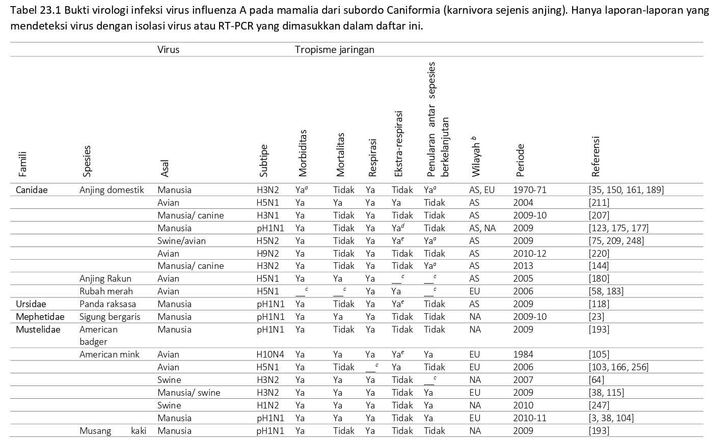 Berbagai spesies termasuk ke dalam Ordo Carnivora, subordo Caniformia, telah terinfeksi virus AI (Tabel 23.1), dan dideskripsikan dengan detail dalam bagian-bagian berikut.
