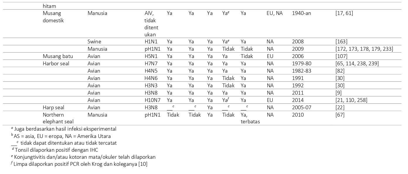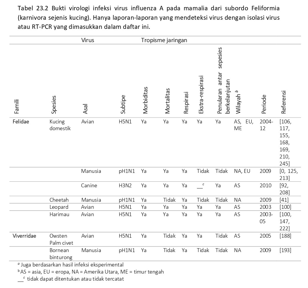 Berbagai spesies dari ordo Carnivora, subordo Feliformia telah terinfeksi influenza virus AIV (Tabel 23.2), dan dideskripsikan secara detail dalam bagian berikut.