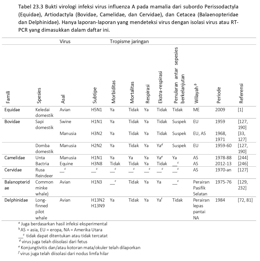 Meskipun terdapat fakta bahwa ordo Artiodactyla (ungulata berkuku genap) memiliki 220 spesies kebanyakan adalah hewan domestik atau buruan yang penting, infeksi AIV telah dilaporkan hanya sporadis pada beberapa spesies saja selain babi domestik dan babi liar (Sus scrofa) yang termasuk kedalam famili Suidae. Bukti infeksi atau terpapar virus AI telah dilaporkan pada sapi (Bos taurus), domba (Ovies aries), kambing (Capra aegagrus hircus), yak (Bos grunnies), dan kerbau air (Bubalus bubalis), yang termasuk ke dalam famili Bovidae, pada alpaca (Lama pacos), yang termasuk ke dalam famili Giraffidae, dan pada rusa kutub (Rangifer tarandus), rusa fallow (Dama dama), dan rusa European roe (Capreolus capreolus) yang termasuk ke dalam famili Cervidae (Tabel 23.3) [53, 54, 63, 71, 127, 131, 187, 190]. Satu-satunya epidemi penyakit pernafasan berat yang disebabkan oleh infeksi AI pada Artiodactyla non-babi dilaporkan pada unta Bactria (Camelus bactrianus), yang termasuk ke dalam famili Camelidae [244]. Influenza pada babi domestik dan babi liar didiskusikan dengan mendetail pada bab 16-19.