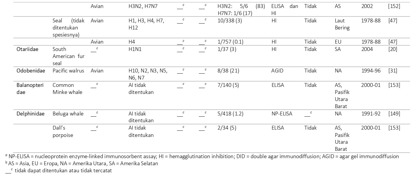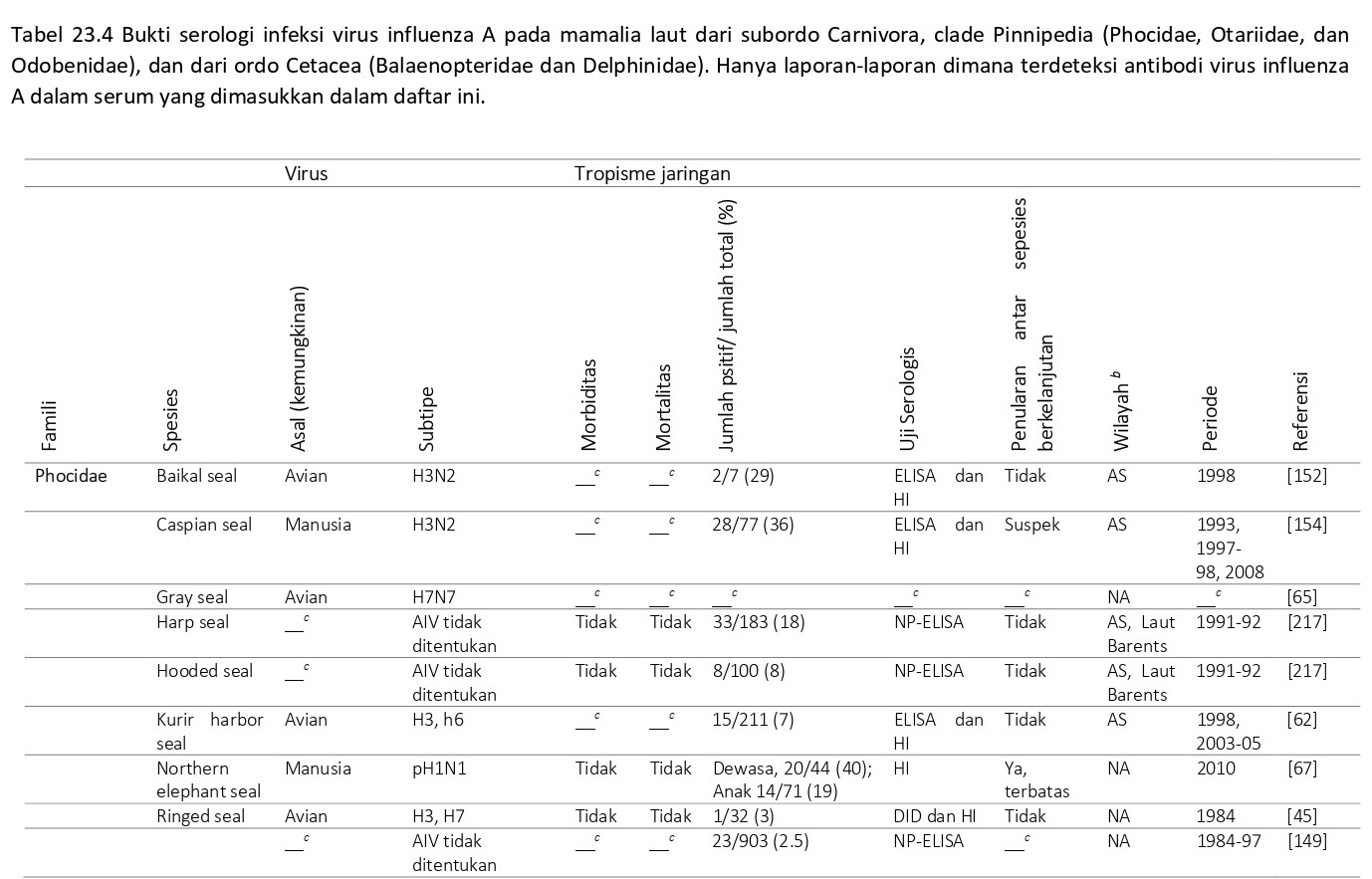 Dari seluruh spesies pinniped yang disebutkan diatas termasuk ke dalam famili Phocidae. Selain adanya bukti serologis infeksi virus AI, terdapat banyak artikel yang melaporkan keberadaan antibodi terhadap virus AI dalam serum pinniped (Tabel 23.4). Bukti serologis ini telah ditemukan tidak hanya pada spesies pinnipedia yang termasuk kedalam famili Phocidae, tetapi juga pada walrus Pasifik (Odobenus rosmarus divergens), yang termasuk ke dalam famili Odobenidae, dan anjing laut berbulu Amerika Selatan (Arctocephalus australis) yang termasuk ke dalam famili Otariidae. Data serologis ni mengindikasikan bahwa kerentanan pinnipedia terhadap infeksi virus AI yang berasal baik dari manusia maupun avian melibatkan lebih banyak spesies daripada yang telah sebelumnya terdeteksi.