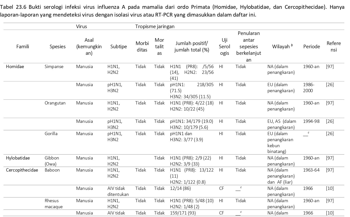 Bukti serologis infeksi virus AI pada primata non manusia (NHP) telah dilaporkan dalam beberapa artikel (Tabel 23.6). Data ini menunjukkan bahwa NHP sering terpapar dan terinfeksi virus AI, tapi cukup resisten terhadap berkembangnya penyakit. Kemungkinan sumber virus AI baik pada NHP yang dipelihara di penangkaran maupun yang hidup bebas adalah manusia yang sering berkontak dengan hewan tersebut. Akan tetapi, sumber lain virus AI (misalnya burung) juga tidak dapat dikecualikan.