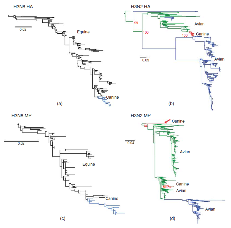 Gambar 22.1 Filogeni menunjukkan sumber awal virus CIV yang telah bersirkulasi secara luas, yaitu H3N8 yang muncul di Amerika Utara sekitar tahun 2000 sebagai varian virus EIV, dan virus H3N2 yang muncul di China dan Korea selama tahun 2005 sebagai varian virus avian. Sekuens HA CIV H3N8 (A) dan MP (C ), dibandingkan dengan sekuens virus EIV H3N8 dari virus-virus yang dikumpulkan dari kuda pada waktu yang berbeda-beda setelah virus muncul tahun 1963. Isolat virus-virus equine ditunjukkan dengan warna hitam, dan virus-virus canine ditunjukkan dengan warna biru. Sekuens HA H3N2 (B) dan MP (D) dibandingkan dengan sekuens virus avian influenza yang ada dalam database. Sekuens CIV ditunjukkan dengan warna merah, virus avian Eurasia ditunjukkan dengan warna hijau, dan virus-virus Amerika ditunjukkan dengan warna biru. Dimodifikasi dari gambar 1 dalam Hayward, J.J., E.J. Dubovi, J.M. Scarlett, S. Janeczko, E.C. Holmes, dan C.R. Parrish. 2010. Mikroevolusi virus canine influenza dalam shelters dan epidemiologi molekulernya dalam Amerika Serikat. Journal of Virology 84:12636-12645, dan Gambar 1 dari Zhu, H., J. Hughes, dan P.R. Murcia. 2015. Asal dan dinamika evolusi virus canine influenza H3N2. Journal of Virology 89:5406-5418.