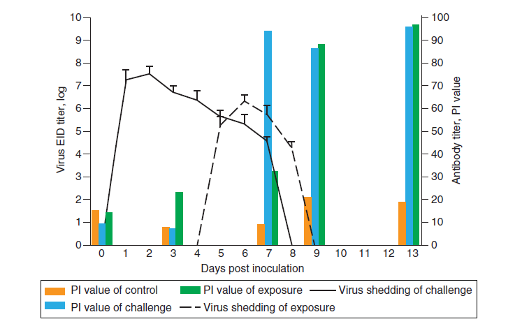 Gambar 22.2 Kurun waktu replikasi virus canine H3N2 pada anjing. Pendedahan virus dan respons serologis pada anjing beagle setelah eksperimen kontak penularan virus CIV H3N2 pada anjing. EID = dosis infeksius dalam telur; PI = persentase inhibisi. sumber : Gambar 1 dari Song, D., C. Lee, B. Kang, K. Jung, T. Oh, H. Kim, B. Park dan J. Oh. 2009. Experimental infection of dogs with avian-origin canine influenza A virus (H3N2). Emerging Infectious Diseases 15:56-58. Diberikan dengan izin.