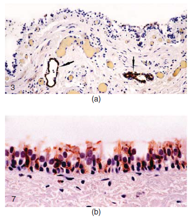 Gambar 22.3 Infeksi dan replikasi virus CIV H3N8 pada anjing setelah infeksi alami atau eksperimental. (A) Bronchus dari anjing greyhound yang diinfeksi spontan dengan virus canine influenza. Terdapat erosi epitel fokal pada epitel permukaan. Sitoplasma sel epitel dan sitoplasma makrofag luminal positif mengandung antigen hemagglutinin (tanda panah). Pewarnaan imunohistokimia adalah untuk antigen virus H3. (B) Trakea anjing 5 hari pasca inokulasi virus canine influenza. Antigen hemaglutinin virus terdapat dalam sitoplasma sel bersilia dan non-silia demikian juga sel basal. Imunohistokimia untuk antigen virus H3. Diambil dari Gambar 3 dan 7 dari Castleman, W. L., J. R. Powe, P. C. Crawford, E.P. Gibss, E.J Dubovi, R.O. Donis, dan D. Hanshaw. 2010. Canine H3N8 influenza virus infection in dogs and mice. Veterinary Pathology 47:505-517, dengan izin dari Sage.