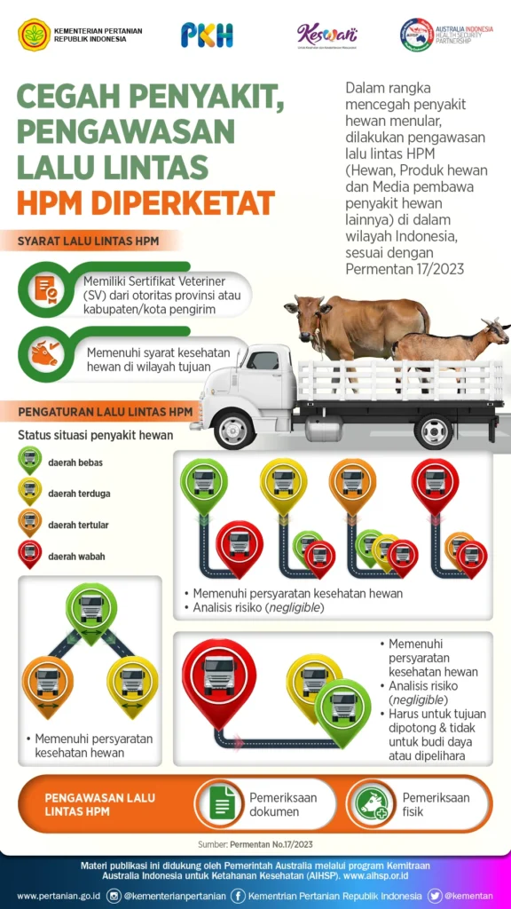 Peraturan Menteri Pertanian No. 17 Tahun 2023 telah mengatur tentang Tata Cara Pengawasan Lalu Lintas Hewan, Produk Hewan dan Media Pembawa Penyakit Hewan Lainnya di Dalam Wilayah Negara Kesatuan Republik Indonesia.